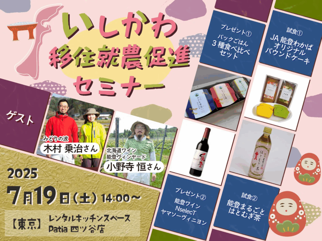 石川の魅力がぎゅっと詰まったイベントです!将来は農業や移住をしてみたい」「田舎暮らしに興味がある」など、将来の働き方や暮らし方を考えている方に向けて【いしかわ移住就農促進セミナー】を開催します。